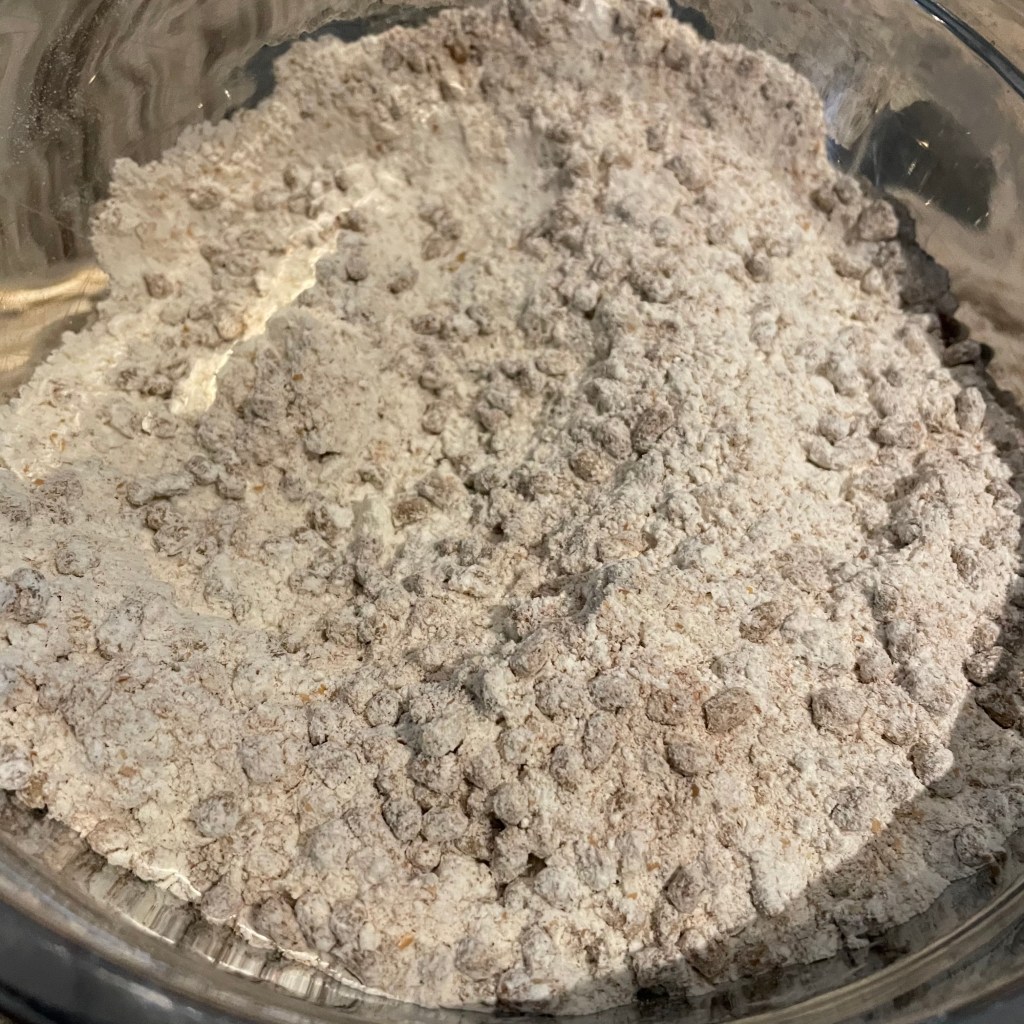 In a bowl, combine the flours, cereal, baking powder, baking soda, salt, and cinnamon.