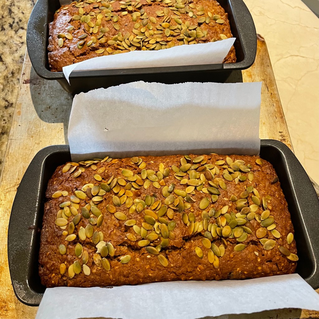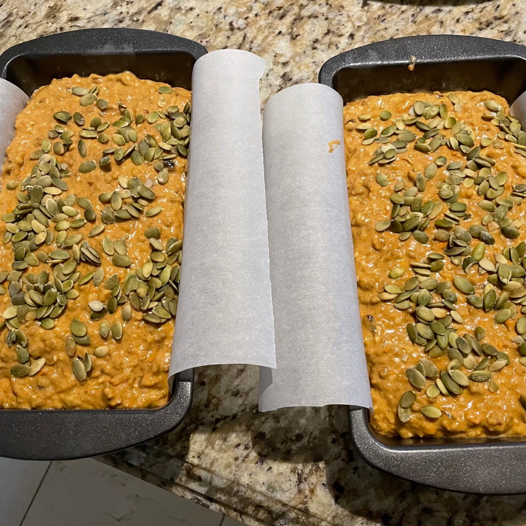 Preheat oven to 350F and line a standard loaf pan with parchment paper sprayed with cooking spray.