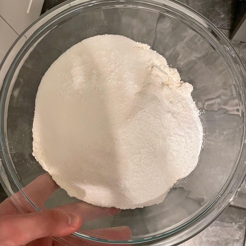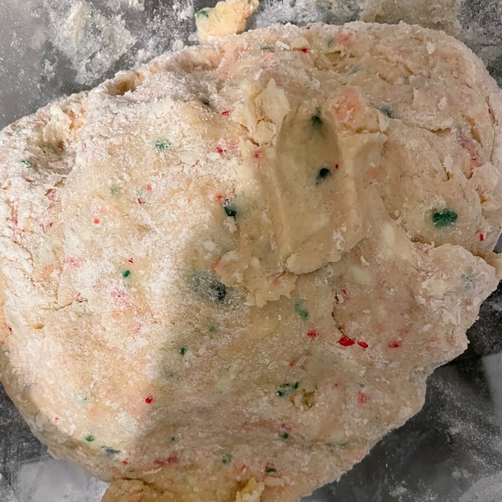 Mix dry ingredients (flour, sugar, crushed candy cane, baking powder, and salt) in a bowl. Grate and add frozen butter. Mix well.